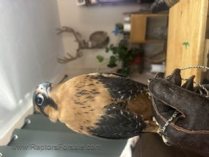 This is a 2025 female chamber raised Aplomado . She is 350g bird that is free flying and chasing game.